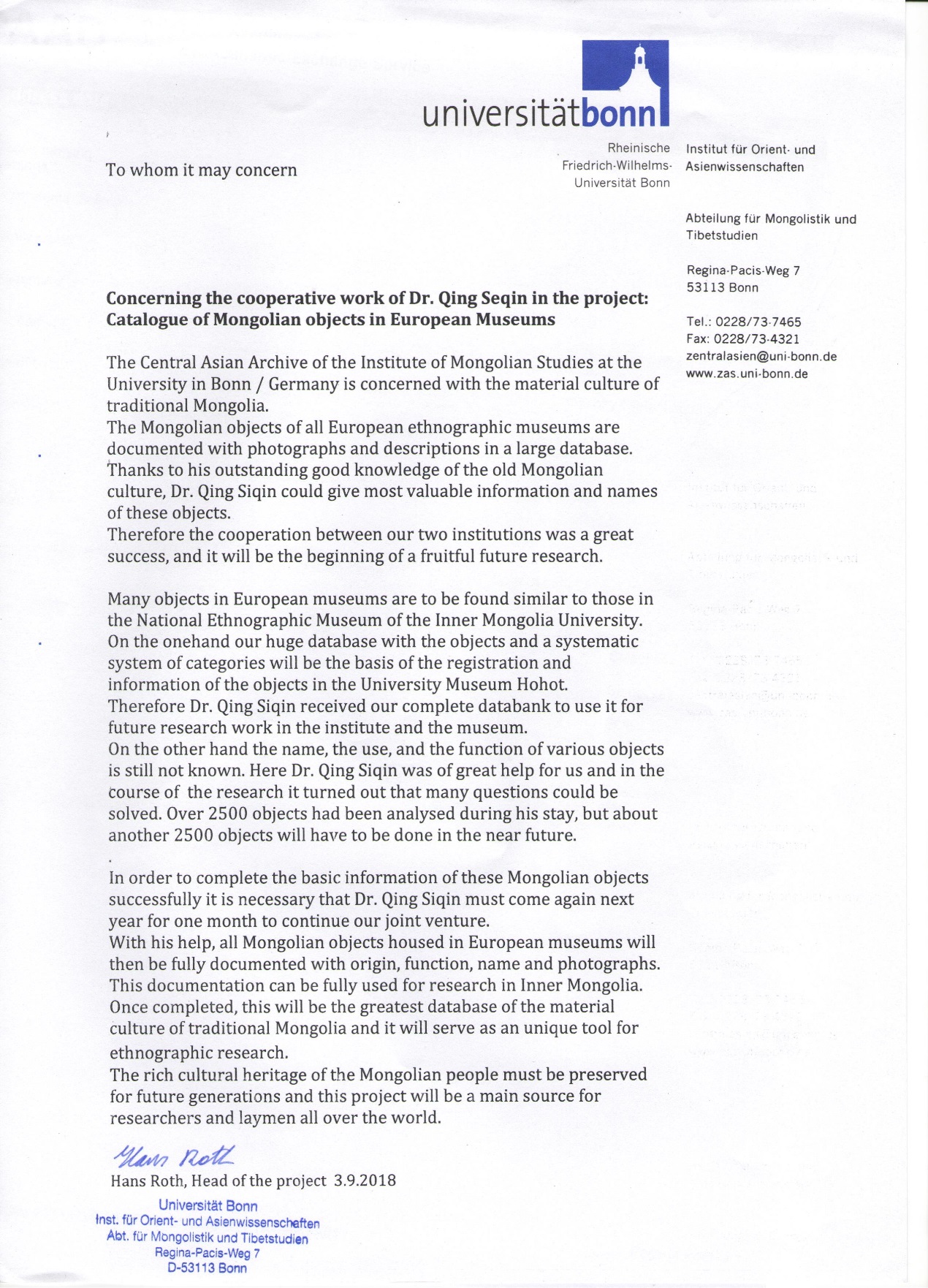 近日公司民族学学科“双一流”建设2018年度建设任务之一、公司与德国波恩大学合作项目“欧洲博物馆藏蒙古物质文化数据库建设”项目取得了重要进展。应德方邀请,suncitygroup太阳集团行政办主任兼民族博物馆负责人青斯琴博士于2018年8月8日至9月6日访问波恩大学,开展了项目相关工作并圆满完成了既定任务。根据双方协议,此次访问主要任务为录入和审核数据库中的丹麦民族学博物馆(数据库编号为040)所藏蒙古文物的信息。工作验收合格后,德方向公司民族博物馆赠送该数据库全部文物信息及其学术使用权。访问期间,双方还就数据库中文版和将公司民族博物馆数字化平台纳入计划等问题达成初步共识。