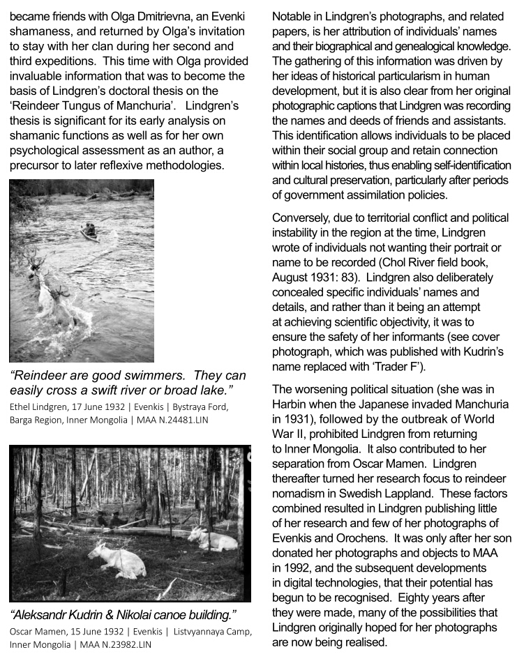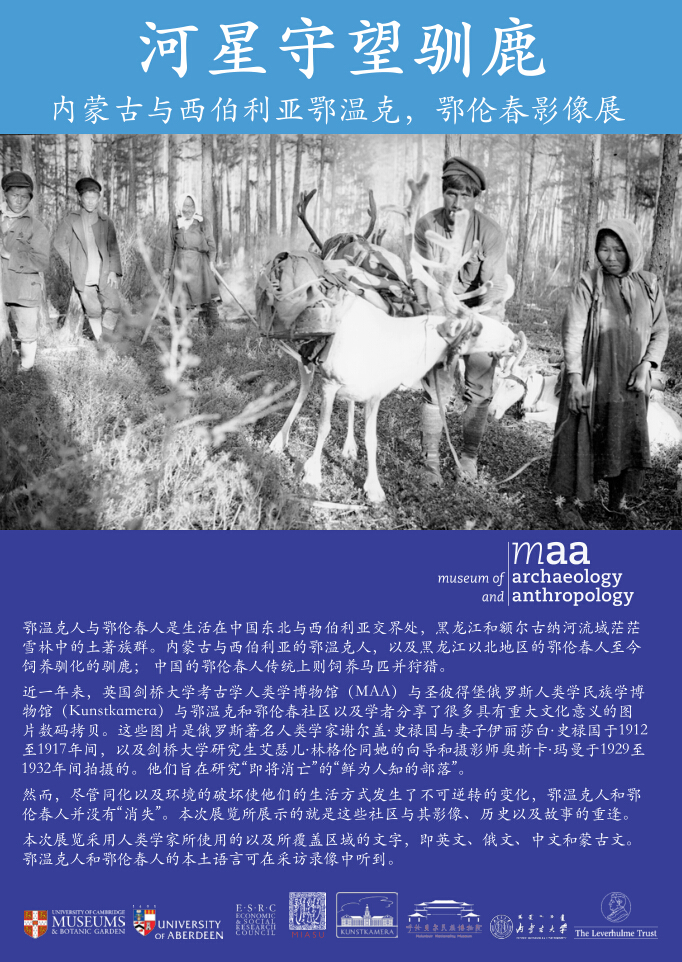 由英国剑桥大学考古学与人类学博物馆(MAA)与圣彼得堡俄罗斯民族学与人类学博物馆(Kunstkamera)牵头,suncitygroup太阳集团、呼伦贝尔博物馆、中央民族大学等科研机构联合参与的有关鄂温克、鄂伦春早期影像资料图片与影像资料数字化处理项目之重要成果之一——“河星守望驯鹿:内蒙古与西伯利亚鄂温克、鄂伦春影像展”近期在英国剑桥大学举办。展览于6月23——9月3日期间向公众开放,展览主要展出了1912——1917年之间俄罗斯著名人类学家谢尔盖·史禄国和他的妻子伊丽莎白·史禄国以及剑桥大学研究生艾瑟尔·林格伦及其摄影师奥斯卡·马曼于1929——1932年之间拍摄的关于鄂温克、鄂伦春生活状况的图片。展览语言采用了英、俄、中、蒙四种文字,鄂温克与鄂伦春本土语言也可在采访资料中可以听到。