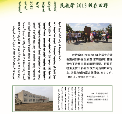 2015年8月,公司2013级民族学同学在民族学系教师阿拉坦宝力格教授、梅花教授和格日乐图博士的带领下,分两处在通辽市科尔沁左翼后期查日苏镇好日花嘎查与赤峰市巴林右旗翁根毛都嘎查进行了为期三周的田野调查。作为民族学的重要研究方法,此次调查意在通过实际操作、亲身访谈帮助同学们更好地将理论与实践相结合,从而提高该专业同学们的研究能力,为日后进行民族学的深入学习作基础。在实习结束后,参与实习的同学制作了实习展板,供师生交流学习。实习最终取得良好成效,同学们纷纷反映收获颇丰。