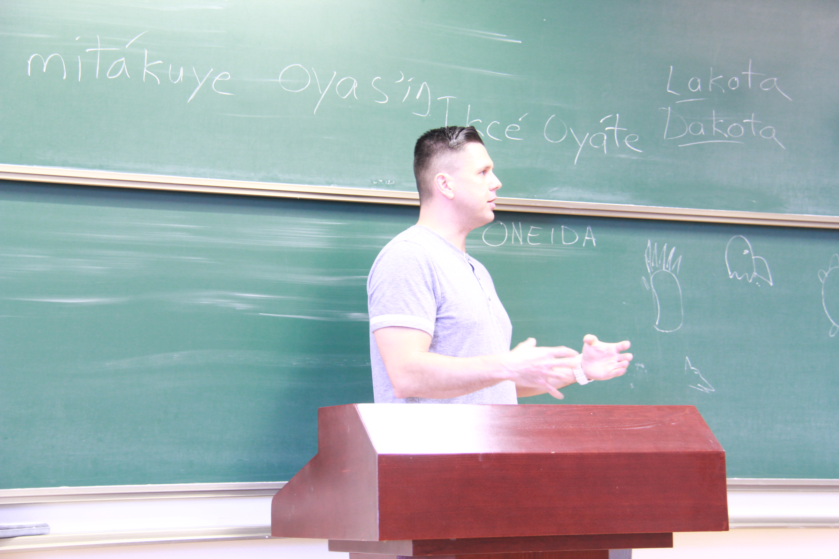 2015年4月23号下午15:30,suncitygroup太阳集团“土而根河”学术讲座在南区主楼603教室开讲。本次讲座由美国中西部原著民艺术家Kevin Loke 和Wayne Silas,Jr.主讲,讲座题目为《北美原住民文化引介》(An introduction to Native American traditions)。首先,两位主讲人以其所在部落原声歌唱和打鼓开始本次讲座,接着,两位原著民分别就其所在部落的语言、神话、宗教、婚姻、社会结构以及传统文化保留与变迁等进行了精彩的讲解,最后,讲座以Kevin Loke演奏传统长笛曲目结束。