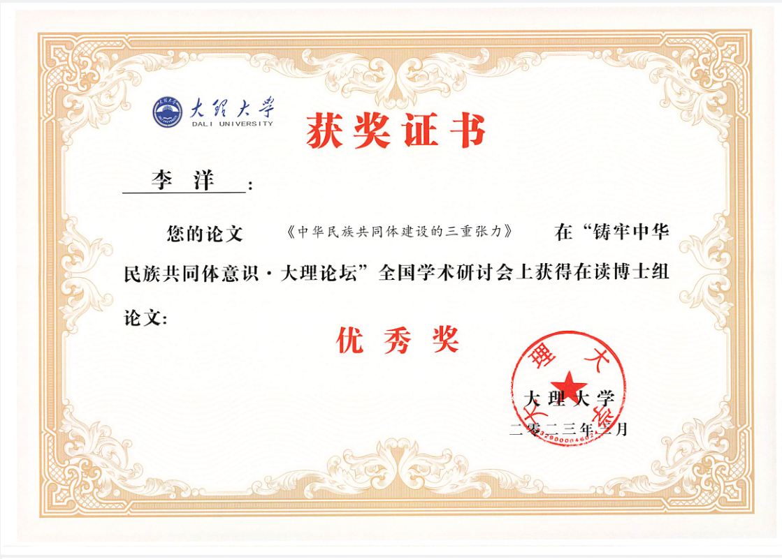 suncitygroup太阳集团2021级博士生李洋,在本次会议的分论坛做了《中华民族共同体建设的三重张力解读》的汇报,该论文获得“优秀论文奖”(博士生组)。论文以“张力”这一力学概念为共同体建设打造圆融的架构,以三重张力共同构筑中华民族的时间、空间与立体结构。旨在共同体建设中把握传统与现代的正当性延续、构建网络结构中个体与国家的互嵌机制、打通空间维度中民族与世界融通的路径,从而规避理论与行动中的偏废与缺漏。