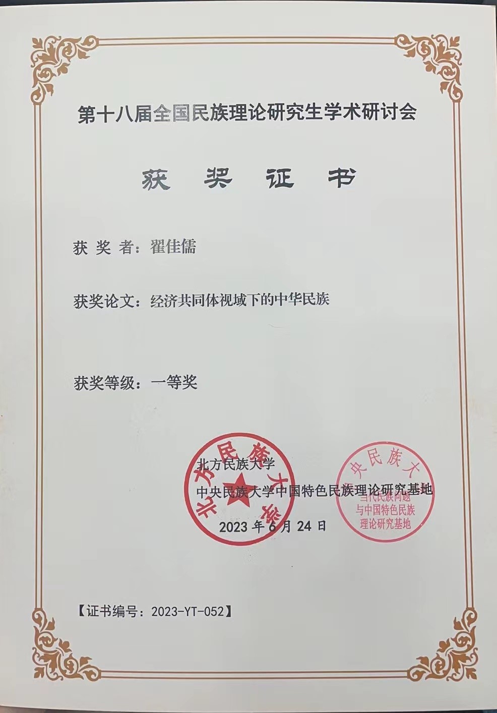 公司研究生积极参会并发言,获奖论文三篇。其中2021级硕士研究生翟佳儒的《经济共同体视域下的中华民族》荣获本次研究生论坛的论文一等奖;2021级博士研究生李洋的《中华民族大家庭话语的内涵意蕴与铸牢中华民族共同体意识》和2021级硕士研究生安格尔的《文化共同体视角下的中华民族共同体解析》分别二等奖。