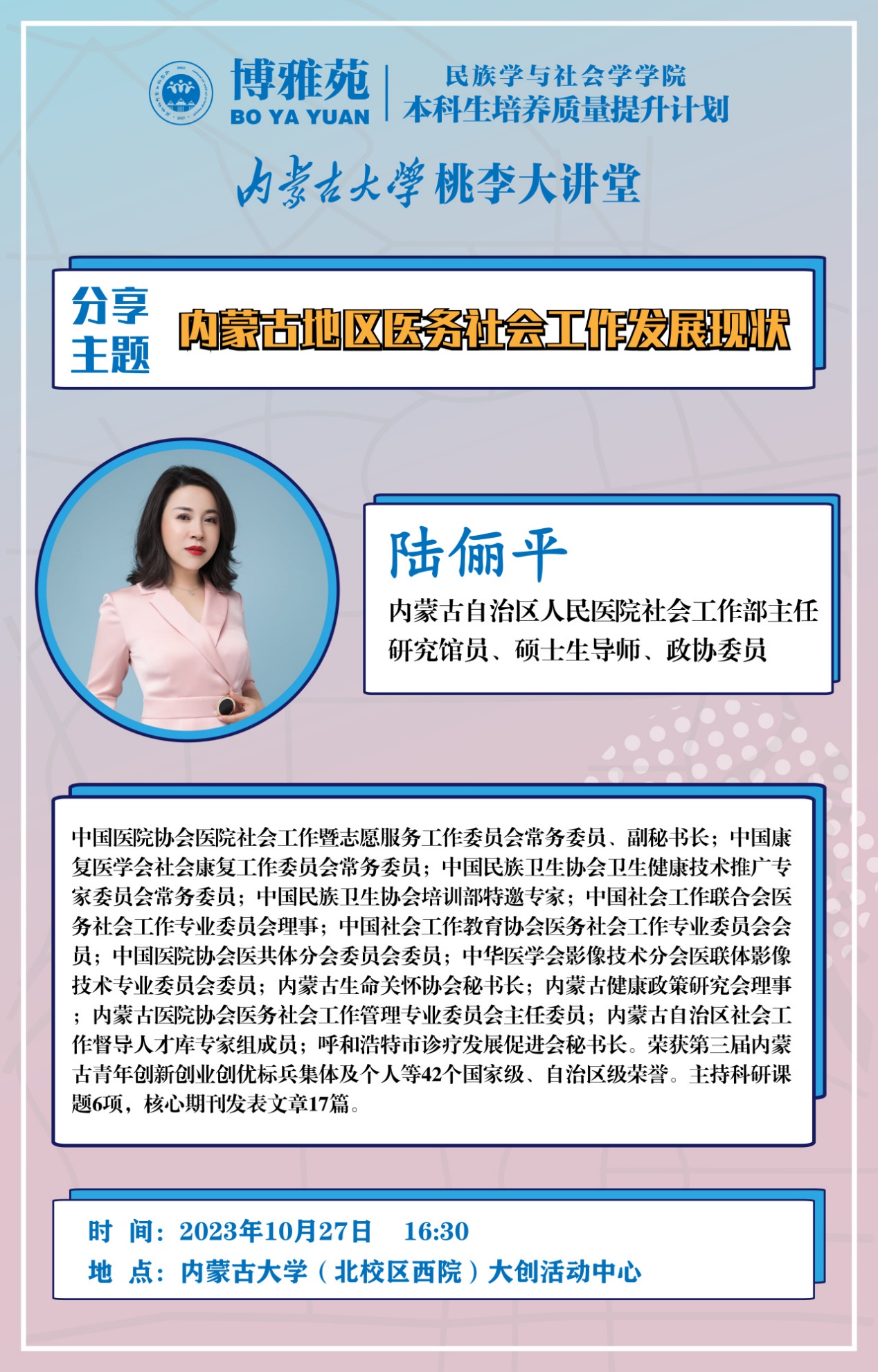 2023年10月27日下午,suncitygroup太阳集团邀请内蒙古自治区人民医院社会工作部陆俪平主任于太阳集团官方网站大创活动中心做了以《内蒙古地区医务社会工作发展现状》为题的讲座。本次讲座由suncitygroup太阳集团副经理李娟副教授主持,内蒙古自治区人民医院社会工作部全体工作人员、社会工作专业师生聆听了此次讲座。