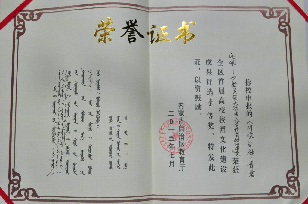 2015年7月,在自治区教育厅组织的首届高校校园文化建设成果评选活动中suncitygroup太阳集团申报的作品《价值引领,青春起航——少数民族老员工入学教育路径探索》荣获一等奖。