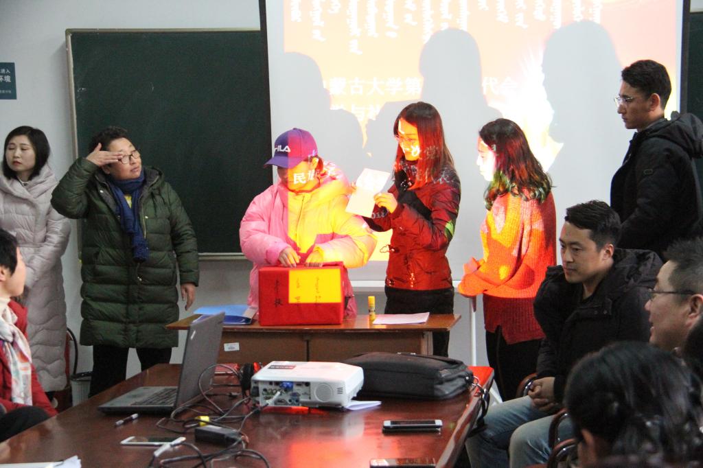 会议第二项,宋跃飞同志宣读监票人建议名单。大会一致通过由青斯琴同志担任监票人一职;宋跃飞同志宣读大会计票人名单。大会一致通过由苏日太、苏日娜同志担任计票人一职。